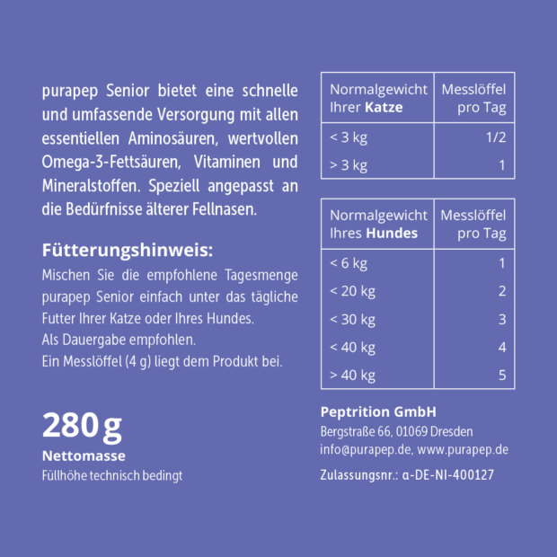 Meine 14 Jahre alte Flat-Coated-Mischlingshündin bekommt seit etwa 10 Wochen das Purapep Senior Pulver täglich ins Futter, sie zeigt deutlich mehr Vitalität und Fitness, läuft wieder mehr und ist mehr bewegungsfreudig. Ich kann dies absolut für alte Hunde empfehlen, es braucht etwas bis die Wirkung eintritt und in Kombination mit moderatem Muskelaufbau und Physiotherapie, hilft es dem Hund sehr wieder besser in Gang zu kommen. Sie hat 1,5 kg zugenommen (Körpermasse), die Muskulatur ist deutlicher spürbar, mehr Muskeltonus vorhanden. Absolut empfehlenswert und wirkt!!!