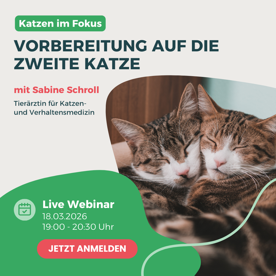 In diesem Live-Webinar „Vorbereitung auf die zweite Katze – Katzenzusammenführung gut gestalten“ erklärt Tierärztin Sabine Schroll, wie eine bestehende Katzenhaltung sinnvoll und stressarm um eine zweite Katze ergänzt werden kann. Im Mittelpunkt stehen die Bedürfnisse der bereits vorhandenen Katze sowie typische Herausforderungen bei der Zusammenführung. Das Webinar richtet sich an Katzenhalter:innen sowie Fachpersonen, die Katzen kompetent auf dem Weg zu einem harmonischen Mehrkatzenhaushalt begleiten möchten.